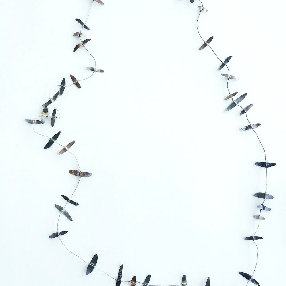I made this necklace inspired by the photograph my grandpa took 30 years ago. The little birds are made of thin silver sheet and soldered. I left the oxidized black and gray colour and used China ink which my grandma left to dye the silk cord gray to represent the monochrome tone from the photograph.